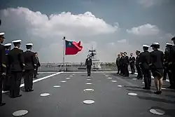 The three cadets had boarded the ship on 21 February, and the fleet left Zuoying Naval Base on 5 March 2020 for a goodwill visit with Palau.[7][9][6] The fleet stayed at Palau from 12 March to 15 March 2020, although the size restrictions at the port in Palau meant that only Kang Ding entered the port.[9] After departing Palau, the fleet remained at sea for roughly a month before returning to Zuoying Naval Base on 15 April.[b][6][9]