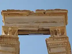 The angle of intersection of the bearing surfaces is subtended by an arc at a. Suppose the wood is removed and a number of axes are placed face-to-face, and that P is a static gravitational load. The arc is extended to an arch, while Q is diverted along the arch, leaving a force-free space below it. The forces at Q, however, must ultimately be countered or the arch will fly apart and collapse. If they are countered, the forces act to compress the wedges. The compressional strength of stone is very high. The alternative structure to an arch, the lintel, or beam across the top of the opening, as in the many prehistoric henges, must support the load in a different way. Every horizontal beam must sag under a load.[7] When it does, the length must extend, subjecting the lintel to tensile forces. As the tensile strength of stone is much lower, the lintel under heavy loads typically breaks and collapses. Many arches survive from antiquity, but few lintels are still in place.