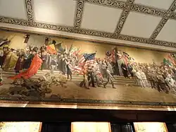 The painting was acquired by US businessmen in 1927 and exported to New York, where it was displayed at Madison Square Garden. It was seen there by one million visitors in 8 weeks.[9] Some small changes were made to make the work more attractive to a US audience: Colonel Edward M. House (by then a politician) was painted out and replaced by the US ambassador to France, Myron T. Herrick; an African-American soldier was also added.[10]