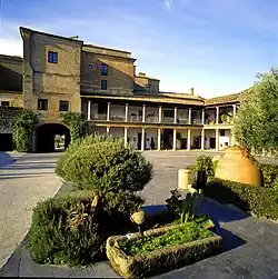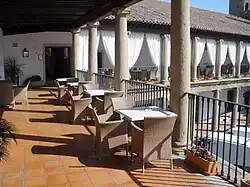 The Parador de Oropesa is established within the complex of the castle of Oropesa. The castle complex consists of four attached major buildings: two castles and two palaces, together known as the Palacio Condal (Comital Palace). The Castillo Viejo (Old Castle) or Patio Musulmán (Muslim Courtyard) dates from the 12th and 13th centuries and the Castillo Nuevo (New Castle) from the 14th and 15th centuries.[1] The Parador is situated in the two palaces, the Palacio Viejo (Old Palace) of the 15th century, and the Palacio Nuevo (New Palace) built in the 16th century.[2]