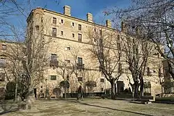 García Álvarez de Toledo's son, Fernán Álvarez de Toledo y Zúñiga, the second lord of Oropesa, with his wife Elvira de Ayala, lady of Cebolla,[6] built the first palace and enlarged the castle at the end of the 14th century.[7] This palace, on the north side of the castle complex and abutting the castle, is a Mudéjar-Gothic building with a long hall room on the upper floor approached from the courtyard by a wide stone interior staircase.[2] The hall was embellished by a polychrome wooden coffered ceiling decorated with the coat of arms of the Álvarez de Toledo family and those of other families connected by marriage. A mirador (lookout point) was built onto the hall, as an internal balcony or loggia open to the air with four foliated Gothic arches. The exterior arch spandrels displayed three coats of arms, one being of the Álvarez family and the other two of the Zúñiga family.[8] Plateresque details were added to the first palace in the 16th century.[2]