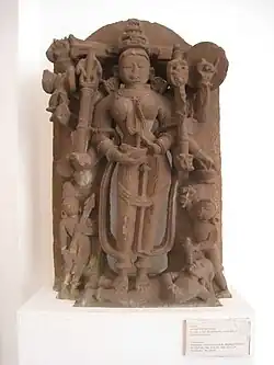 Bhoja's attempt to expand his kingdom eastwards was foiled by the Chandela king Vidyadhara.[49] However, Bhoja was able to extend his influence among the Chandela feudatories, the Kachchhapaghatas of Dubkund.[50] Bhoja also launched a campaign against the Kachchhapaghatas of Gwalior, possibly with the ultimate goal of capturing Kannauj, but his attacks were repulsed by their ruler Kirtiraja.[51] Bhoja also defeated the Chahamanas of Shakambhari, killing their ruler Viryarama. However, he was forced to retreat by the Chahamanas of Naddula.[52] According to medieval Muslim historians, after sacking Somnath, Mahmud of Ghazni changed his route to avoid confrontation with a Hindu king named Param Dev. Modern historians identify Param Dev as Bhoja: the name may be a corruption of Paramara-Deva or of Bhoja's title Parameshvara-Paramabhattaraka.[53][54] Bhoja may have also contributed troops to support the Kabul Shahi ruler Anandapala's fight against the Ghaznavids.[55] He may have also been a part of the Hindu alliance that expelled Mahmud's governors from Hansi, Thanesar and other areas around 1043 CE.[56][41] During the last year of Bhoja's reign, or shortly after his death, the Chaulukya king Bhima I and the Kalachuri king Karna attacked his kingdom. According to the 14th-century author Merutunga, Bhoja died of a disease at the same time the allied army attacked his kingdom.[57][58]