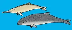 Reconstruction of Parapontoporia pacifica (top) with the fossil porpoise Piscolithax tedfordi | |