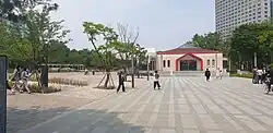 The park has a number of facilities, including a Seoul Plaza, a Paris Plaza, a pond with fountains in it, and a courtyard that blends elements of French and Korean design. Seoul Plaza is decorated with various Korean national symbols, including the flag of South Korea. Paris Plaza is similarly decorated, but with French symbols such as the flag of France and a model of the Eiffel Tower. The park has various outdoor exercise equipment,[1] as well as basketball courts and table tennis tables.[2] When the weather is warm, there are various water fountains and pools for children to play inside of.[2][4][5] There are covered sitting areas, with air purifiers, heaters, and air conditioners. Smart benches have spots for charging phones using electricity generated from solar panels, and public Wi-Fi is available. There are also poles with buttons for calling emergency services.[2] The park has space for hosting events, such as weddings and concerts.[2]