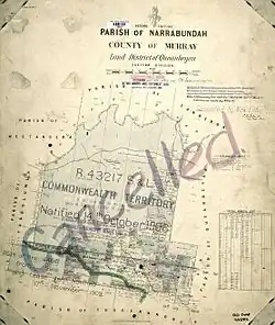 Narrabundah Parish is a former parish of Murray County, New South Wales, a cadastral unit for use on land titles. It was formed in the nineteenth century, and existed until 1 January 1911, when the Seat of Government (Administration) Act 1910 came into force, after the land was transferred to the Commonwealth government in 1909 to be used to form the Australian Capital Territory.