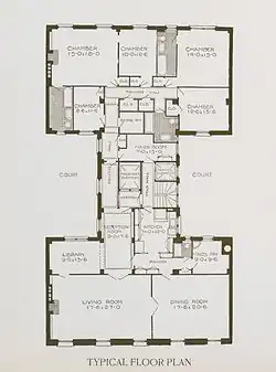 Originally, the building consisted of one apartment per floor, consisting of 6 bedrooms, 4 bathrooms, a library and a 17.5 by 47.5 feet (5.3 by 14.5 m) drawing room and dining room.