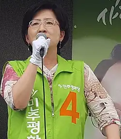 Prior to the 2016 election, Park was brought into the People's Party and ran 3rd in the party list. In 2018, she declared to quit from the PP along with the other dissidents due to the disagreement of the party's decision to merge with the Bareun Party (BP) (both were later merged into the Bareunmirae Party).[4] She, along with Lee Sang-don and Chang Jung-sook, was planning to join the Party for Democracy and Peace (PDP) but unable to do so as PRs are not allowed to exit from their original parties; if they do so, their parliamentary membership will be automatically revoked.[5] Though the law did not allow her to exit, however, the PDP allowed her to hold party positions with holding Bareunmirae membership.[5] She was shortly considered as the potential candidate for the Governor of North Jeolla that can overcome the matter.[6]