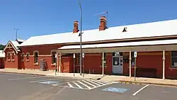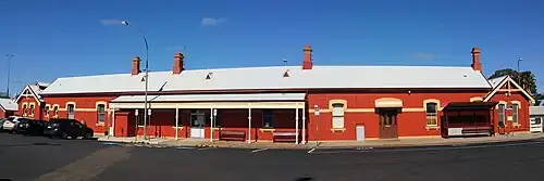 The complex includes a type 4, brick standard roadside third class station building, completed in 1893, and brick platform; both managed by RailCorp.[1] Other major structures includes a brick railway refreshment room, erected c. 1928; a type O, elevated fibro signal box, erected 1944; the 1942 railway precinct including locomotive servicing facilities including turntable; a goods shed; and the Silver City Comet Shed and associated structures; all managed by the Australian Rail Track Corporation (ARTC).[1] The ARTC also manages a dock platform, a steel Warren truss footbridge, erected 1935; and a jib crane.[1] The brick barracks building (c. 1912), former Railway Institute building (1962), and the repair siding shed are now owned and managed by Pacific National.[1]