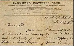 Parkhead Football Club was a Scottish football club from the Parkhead district of Glasgow who played in Scottish Junior Football Association competitions from their formation in 1880 until going out of business in 1963. In the early years of the Scottish Junior Cup, Parkhead appeared in nine finals and won the cup five times. The club supplied eight players who went on to become full Scotland internationals later in their careers and Andy Auld who played five times for the US national team.[1]