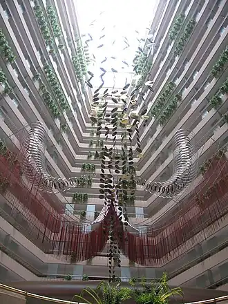 Designed by John Portman, the hotel has one of the largest open atriums in Southeast Asia, which rises through 21 levels and is permeated by natural light. Each of the 575 rooms is accessed from the balconies overlooking the atrium, and has views of the Singapore harbour and the city skyline.