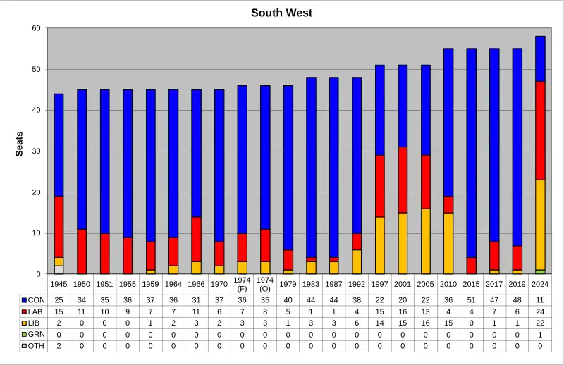 The region[1] of South West England is divided into 58 parliamentary constituencies, which are made up of 16 borough constituencies and 42 county constituencies. Since the general election of July 2024, 24 are represented by Labour MPs, 22 by Liberal Democrat MPs, 11 by Conservative MPs, and 1 by a Green MP.
