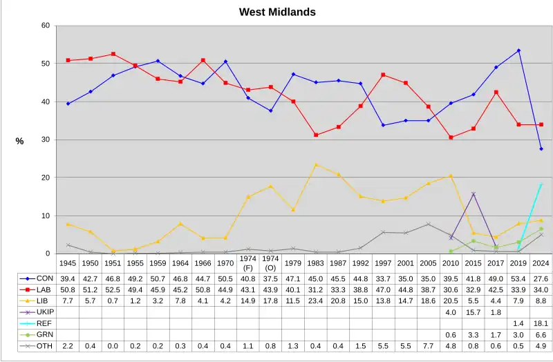 The region[nb 1] of West Midlands is divided into 57 parliamentary constituencies which is made up of 28 borough constituencies and 29 county constituencies. Since the general election of July 2024, 38 are represented by Labour MPs,15 by Conservative MPs, 2 by Liberal Democrat MPs, and 1 by an independent MP.