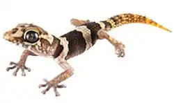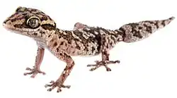 The holotype individual has a snout–vent length of 68.3 mm, with a triangular head measuring 19.9 mm long, 15.3 mm wide and 8.7 mm tall. The rostral scale and nostrils are separated by prenasals. Regular longitudinal rows of dorsal-enlarged keeled scales are prominently present. The tail is 49 mm long, with very spiny and mostly keeled scales. The dorsal scales of the limbs are similarly keeled, and the digits possess expanded tips with downward-curving claws and adhesive pads. This lizard has ochre and light brown background colors with contrasting darker brown markings across the body. In juveniles, the dorsum has three broad light crossbands.[1]