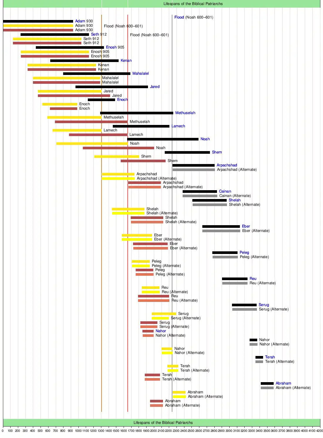 - Lifespans recorded in the Masoretic text: Crimson (▄▄), vermilion (▄▄), and cinnabar (▄▄)