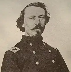 XVI Corps commander Maj. Gen. Grenville M. Dodge ordered Sweeny to push forward in an attempt to strike at Johnston's army as it retreated. Sweeny's Division represented the furthest extension of Sherman's army. Burke was ordered to push forward toward Rome-Calhoun Road and the Sugar Valley-Adairsville Road, near Calhoun, Georgia. Burke's forward-most unit was Company G, 66th Illinois, under the command of Captain George Taylor.[18] Taylor advanced his men beyond the crossroads, triggering a counterattack led by the 24th Georgia Infantry and the 1st Battalion Georgia Sharpshooters, resulting in the Battle of Rome Cross Roads.[19] The Georgians overwhelmed Taylor's men and threatened to punch through the attenuated Federal skirmish line. Burke hurried the rest of the 66th Illinois and 81st Ohio forward to blunt the Confederate attack. As he was organizing the defense, Burke was struck in the left leg by a bullet which shattered the bone. Burke turned over command of the brigade to Lieutenant Colonel Robert N. Adams, commander of the 81st Ohio and withdrew from the battlefield.[20]