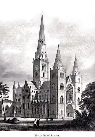 Hepburn seems to have been uneasy with the Scottish Reformation. Although he agreed in principle to modify the structure of Elgin Cathedral to accommodate Protestant forms of worship, few powerful figures on the reformist side trusted him. During the Civil War of 1567, the bishop pledged his support to James Hepburn, Earl of Bothwell, and was accused of giving him shelter during his flight northwards to Scandinavia.[1] Perhaps in an act of reprisal against the bishop's defiance, the privy council ordered the removal of the lead water-proofing from Elgin Cathedral and although the council ordered its replacement in 1569, there is no evidence that this was carried out.[12] He was finally forfeited of his bishopric by parliament in August 1571. He held out in Spynie Palace where he died on 20 June 1573.[13] Hepburn, the last pre-reformation bishop of Moray, was buried in the cathedral choir.[14]
