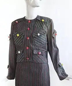 Kelly began to sell his designs at the trend-setting Victoire boutiques in Paris.[5] In an interview, the store's buyer said, "Patrick landed like a bomb in my shop in 1985. He was so gay and so full of energy, and so were his clothes."[6] Also in 1985, the French edition of Elle Magazine covered Kelly with a six-page spread in its February issue.[7] During this period, he began to acquire celebrity couture clients, such as Bette Davis, Paloma Picasso, Grace Jones, Madonna, Cicely Tyson and Goldie Hawn.[8] He also participated in a notable collaboration with jewelry designer David Spada, one product of which was one of Kelly's most famous designs, a Josephine Baker-inspired ensemble with a banana skirt now in the collection of the Philadelphia Museum of Art.[9][10]