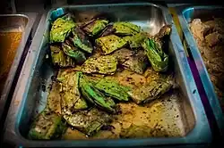 Paturi can be prepared with a wide variety of ingredients, both vegetarian and non-vegetarian. However, among non-vegetarian dishes of paturi, fish dishes are more prevalent.[3] Different types of paturi are prepared from different fish like Bhetki paturi, Ilish paturi, Koi paturi,[4][5] Rui paturi etc. Apart from fish, there are egg dishes too, and even fish egg dishes are made.[6][7][8] Paturi is also prepared with prawns, known as chingri paturi.[9]