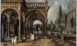 Vredeman de Vries specialised in architectural paintings and, in particular, imaginary church interiors and palaces.[2] His paintings show a meticulous attention to perspective. He developed an original poetic vision in his mature years. The facades of palaces that are richly ornate and the colonnades of which open onto flowered courtyards with fountains and sculptures provide the setting for scenes from ancient history or sacred history. The rigour of the geometric composition, which incorporates the principles of the contemporary treatises on perspective, is tempered by an atmospheric rendering of the light with its silvery shimmers. The interiors are a reconstruction of the interior decoration of his day such as chairs trimmed with leather, embossed leather hangings and canopies with valances.[8]