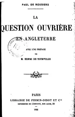 - Paul de Rousiers (1895), La question ouvrière en Angleterre, Preface by Henri de Tourville, Paris: Firmin-Didot, p. 532