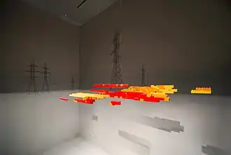 A year later, in November 2016, the series was exhibited at the exhibition Mall. The Time of Colorful Sheds was organized as part of the Non-Places Programme run by the Department of Research Art and hosted by the Smena Center of Contemporary Culture in Kazan. In 2015, Otdelnov's contemplations on the notion of glitches in the post-Soviet landscape were presented at two other exhibition projects. In July 2015, he made a total installation for the exhibition Piece of Space Traversed by Mind at the New Wing of Gogol Museum on Nikitsky Boulevard: he painted a monochrome landscape on the walls with a snow field, gray sky, and power transmission line pylons, and the "glitch" was manifested in Lego bricks suspended on thin wire. In 2015, Otdelnov also participated in Expanding Space. Art Practices in the Urban Environment, a project aimed at creative exploration of contemporary phenomena and features of Moscow, organized by V-A-C Foundation. Otdelnov proposed a large-scale object constructed with bright composite panels to be installed next to the Moscow Ring Road near the 81st kilometer. It employed the parallax effect to make the structure seem stably whole from one vantage point but, as the perspective shifts, to disintegrate into parts becoming fluid and unstable. This piece was meant to imitate abandoned or uncompleted mall projects that look like a disruption in the landscape and, at the same time, symbolize the volatility in the economy.[40][41][42][43][44][45]
