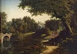 Cameron laid out a triple alley of five straight rows of linden trees, imported from Lübeck, in a long axis from the courtyard of the Palace, leading to a small semi-circular place in the forest. This served as a parade ground for Tsar Paul's Imperial guards. In the forest to the left of this axis he placed a romantic thatch-roofed dairy with stalls for several cows modeled after the one in the park of Württemberg; and on the other side of the parade route, an aviary, filled with parakeets, nightingales, starlings, and quail. This part of the garden also included a labyrinth, and picturesque tombstones imported from Italy. An early French visitor described the effect of this part of the garden: "Melancholy consumes the soul when you arrive...then the pain is followed by pleasure."[2]