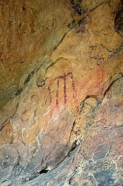 The rock and cave art is found in shelters made of sandstone. The paintings, of symbolic character, appear in twenty-five of these shelters and date from the post-Paleolithic era. Within their complex designs, one finds isolated patterns grouped together. The designs were produced with different shades of red mainly using the fingers. Anthropomorphic shapes predominate and were represented in a variety of ways, some with added elements showing headdresses, costumes, weapons, etc. The painted objects themselves are also varied and remain characteristic of these displays; they comprise arrangements which are circular, branched, bi-triangular, quadrangular, braided, comb-like and ocular.