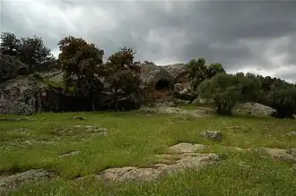 The Dolmen del Tajillo del Moro complements the rock and cave painting of Peñas de Cabrera and shares a similarity to its ritual and symbolic nature. After its excavation, a Megalithic[2] structure was found consisting of an oval chamber and a corridor divided into two parts which served as a tomb for three individuals. The trousseau is made of ceramic material containing globular and hemispherical bowls and plates, largely completed with pieces of silex (flint), among other things.