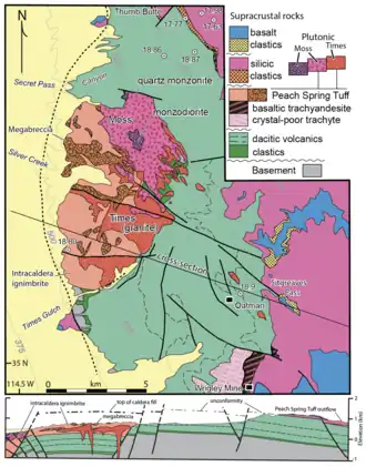 - ^ a b c Ferguson, Charles A.; McIntosh, William C.; Miller, Calvin F. (2013). "Silver Creek Caldera- The Tectonically dismembered source of the Peach Spring Tuff". Geology. 41–1 (1): 3–6. Bibcode:2013Geo....41....3F. doi:10.1130/G33551.1.