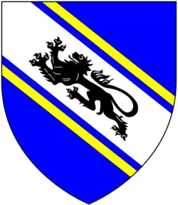 The Kekewich arms are: Argent, two lions passant guardant in bend sable between two bendlets gules.[42]