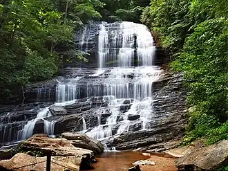 Pearson's Falls is located in the foothills of Western North Carolina off Hwy. 176 between Tryon and Saluda. This wildlife and bird sanctuary comprises 268 acres (108 ha) of native forest, granite, spring-fed streams and a moderate 1/4 mile trail to a 90-foot (27 m) waterfall. There are over 200 species of rare wildflowers and plants. There are also mosses, lichens, shrubs and trees in this glen, which is classified as a deciduous climax forest. Pearson's Falls is owned and maintained by The Tryon Garden Club, a non-profit 501 (c)(3) organization.[1]