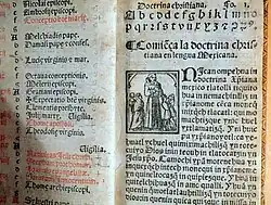- Doctrina Christiana en Lengua Mexicana. Per signum crucis. Icamachiotl cruz yhuicpain toya chua Xitech momaquixtili Totecuiyoc diose. Ica inmotocatzin. Tetatzin yhuan Tepilizin yhuan Spiritus Sancti. Amen Jesús (first published ca. 1547, Mexico: Juan Pablos; 1553, Amberes; 1553, Mexico: Juan Pablos, 1555. Facsimile edition with comments by ed. Ernesto de la Torre Villar (Mexico, 1981).