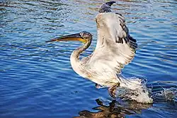 Takeoff from water is particularly energetic. The pelican requires strong pushes with both feet and heavy flapping of its broad wings to become airborne, especially when carrying a full pouch of fish.[33]