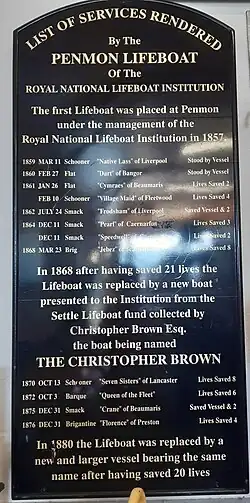 Costing £251, a 30-foot 10-oared self-righting boat was provided to Penmon in 1868, again built by Forrestt. The lifeboat was funded by the Settle, North Yorkshire branch of the RNLI, the boat being named Christopher Brown, after their primary fundraiser.[9][10]