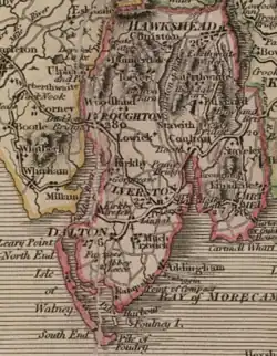 There are a set of stocks outside the church gate that were used to punish offenders and there are runic inscriptions within the churchyard. In late 11th century England, Pennington is mentioned in the Domesday Book as one of the townships forming the Manor of Hougun which was held by Tostig Godwinson, Earl of Northumbria.[7] The manor is exactly the same size as the parish which formerly belonged to the Cistercian Abbey of Furness, and includes 4,160 acres or six and one-half square miles. The parish was the smallest in Lancashire. The village was composed of 50 houses and 284 people in the mid-nineteenth century, and is about the same size today. The first recorded occurrence was spelled Pennigetun in the book.