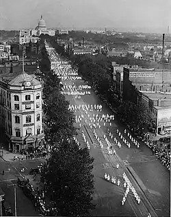 This precedent was exercised 12 years later. On August 8, 1925, at least 25,000 and perhaps as many as 75,000 members of the Ku Klux Klan marched on Pennsylvania Avenue.[161][162][163] The Klan repeated its march with a similar number of participants in 1926. The marches signified the height of the Klan's power in the United States, even as it was about to lose much of its strength.[162][164]