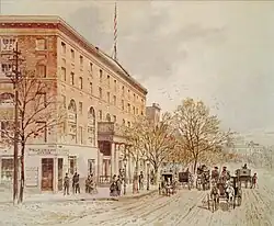 The city's first school, the Western School, opened on the south side of Pennsylvania Avenue between 17th and 18th Streets NW in January 1806.[38] The city's first sewer pipe was laid under Pennsylvania Avenue in 1829.[39] By 1835, Pennsylvania Avenue was largely lined by two- to four-story Federalist row houses.[40] The Baltimore and Ohio Railroad converted a house at the corner of 2nd Street NW and Pennsylvania Avenue into the city's first train station.[41] It was abandoned in 1851 when the station moved to a more long-lasting location at New Jersey Avenue and C Street NW.[42] The same year, the National Theatre opened on December 7.[43] It was followed by the 400-seat Odeon in 1846, the 1,000-seat Adelphi in 1847, and Metzerott Hall in the 1860s.[44] President Andrew Jackson approved the construction of the Treasury Building in 1836 (it was completed the following year), but the size and height of the building forced a rerouting of Pennsylvania Avenue and blocked the view of the White House from L'Enfant's "Grand Avenue."[45] The city's first stock brokerage was opened by William W. Corcoran at 15th and Pennsylvania Avenue in 1837.[46] The city blocks where the National Gallery of Art now stands became a fashionable residential area in the 1830s.[47]