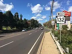 Pennsylvania Route 132 (PA 132) is a state highway in southeast Pennsylvania. The route, which is signed east–west, runs northwest to southeast through Bucks County in suburban Philadelphia from PA 611 in Warrington southeast to Interstate 95 (I-95) in Bensalem. PA 132 is a commercial route lined with shopping centers throughout much of its 15-mile (24 km) length. It is named Street Road for its entire length and is five lanes wide for much of its length. The route was also designated as the Armed Forces and Veterans Memorial Highway in 2005. From west to east, PA 132 intersects PA 263 and PA 332 in Warminster; PA 232 in Southampton; PA 532 in Feasterville; and U.S. Route 1 (US 1), the Pennsylvania Turnpike (I-276), PA 513, and US 13 in Bensalem. Street Road was included in William Penn's survey plans and completed by 1737. The road was paved by 1911 and received the PA 132 designation between US 611 (now PA 611) and US 13 by 1927. The route was widened into a multilane highway and extended east from US 13 to I-95 by 1970. An interchange with the eastbound direction of the Pennsylvania Turnpike opened in 2010.