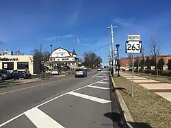 Pennsylvania Route 263 (PA 263) is a north–south state highway located in southeast Pennsylvania. The southern terminus of the route is at PA 611 in Willow Grove, Montgomery County. The northern terminus is at the Centre Bridge–Stockton Bridge over the Delaware River in Centre Bridge, Bucks County, where the road continues into Stockton, New Jersey, as Bridge Street to an intersection with Route 29. PA 263 follows the routing of Old York Road, a historic road that connected Philadelphia to New York City, and carries the name York Road from the southern terminus to Lahaska and Upper York Road north of there. From Willow Grove to Buckingham, PA 263 runs mostly through suburban areas as a four-lane road, passing through Hatboro, Warminster, and Jamison. The route forms a concurrency with U.S. Route 202 (US 202) in Buckingham and narrows to a two-lane road, splitting with that route in Lahaska. From there, the route continues through rural areas to Centre Bridge.