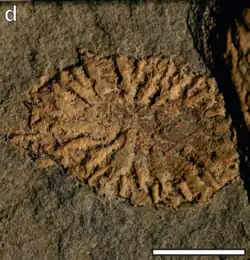 Persimedusites chahgazensis is a Precambrian discoidal species which are believed to have existed primarily during the late Ediacaran period.[1] It was discovered initially in the Kushk Series in the Bafq and Behabad regions of central Iran, along with similarly aged specimen of Cloudina and Corumbella.[2][3] The body fossils of these disc-shaped organisms are approximately one centimeter in diameter, and were noted to have symmetrical internal lobes, as well as secondary distal branches.[4]
