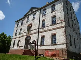 A few of the buildings from this early period can still be seen today.[25] Most notably, the Proprietary House, the home of William Franklin, the last Royal Governor of New Jersey and estranged son of Benjamin Franklin, still stands in the waterfront area of the city. Architect John Edward Pryor was hired in 1761 to design and construct the building, which was completed in September 1764, years late and over budget. Franklin preferred his alternate home in Burlington.[35] Franklin finally moved in 1774 into the Proprietary House. Franklin's father, Ben, tried unsuccessfully to convince his son to support the Colonial cause. William Franklin was arrested and detained at Proprietary House in 1776 until he was tried and convicted of treason.[36]