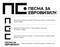 The general slogan is based on the beginning letters of the words "song", "Eurovision" and "Serbia" in Cyrillic, with the name of the contest written next to it.[4]