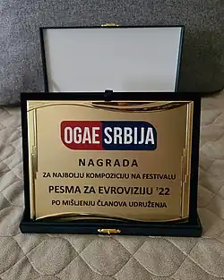 Following the event, the fan organisation OGAE Serbia voted on the best song at Pesma za Evroviziju '22 as decided by association members. The award was won by the winning song "In corpore sano" with 256 points. Second place, with 233 points, came from the song "Muškarčina" by Sara Jo, while third place went to Zorja and her song "Zorja" with 143 points. Sara Jo was also the winner of the OGAE Second Chance, which was awarded after a round of voting with all entries, not including the winning song of the event.[30]