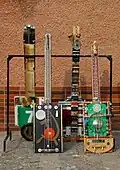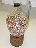 After the Postoj, Kalmus participated at many art exhibitions in Slovakia and abroad.[5] Kalmous considers creating art to be his lifestyle.[6] His work reflects the public obsession with consumerism as well politics, death, religion, sports.[7] He has several long-running projects, including the cycles Partitúry (Scores) and Korózne grafiky (Corrosive Prints). Perhaps his well-known long-term project has consisted of wrapping a wire around at least one stone every day between 1998 and 2022, representing the 70 000 Jews deported from Slovakia by the fascist Slovak Republic during the World War II.[3] A Peter Kalous' Holocaust monument, consisting of four glass tubes filled with the wire-wrapped stones, was first uncovered in 2016 by the President of Slovakia Andrej Kiska. It is located in a renovated synagogue in the town of Lučenec.[8]