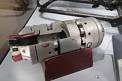 The Harvey flamethrower was introduced in August 1940, and was mostly made from readily available parts such as wheels from agricultural equipment manufacturers and commercially available compressed air cylinders.[95] It comprised a welded-steel cylinder containing 22 gallons (100 L) of creosote and a standard bottle of compressed nitrogen at 1,800 pounds per square inch (120 bar) mounted on a sack truck of the type that a railway-station porter might use. About 25 ft (7.6 m) of armoured hose provided the connection to a four-foot-long (1.2 m) lance with a nozzle and some paraffin-soaked cotton waste that was set alight to provide a source of ignition. In operation, the pressure in the fuel container was raised to about 100 psi (6.9 bar), causing a cork in the nozzle to be ejected followed by a jet of fuel lasting about 10 seconds at a range up to 60 ft (18 m).[96] Like the Home Guard flamethrower, it was intended as an ambush weapon, but in this case the operator was able to direct the flames by moving the lance which would be pushed through a hole in otherwise bulletproof cover such as a brick wall.[97][95][98][99]