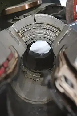 Later versions were a little more sophisticated; remote ignition could be achieved in a variety of ways. In one system, called the Birch Igniter, the pressure of the oil at the end of the pipe would squeeze glycerine from a rubber bulb; the glycerine would fall onto a container of potassium permanganate, which would then ignite spontaneously. Another method was to run a pair of small rubber tubes, down one of which would be passed acetylene and the other chlorine; when, at the far end, these two gases were allowed to mix, there would be a spontaneous ignition. This system had the advantage that it could be turned on and off repeatedly.[27] The development of the flame fougasse (see below) provided a method of remote electrical ignition that could only be used once, but was virtually instantaneous.[25]