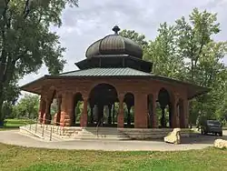 The park's octagonal pavilion was constructed from Minnesotan red stone and dedicated in 1903.[5] After Pettibone's death, a large stone was placed near the pavilion in his memory. The memorial, a 21-ton stone with a plaque, was proposed by John Nolen. The stone was transported to La Crosse from Milwaukee by railcar. Once in La Crosse, it had to be moved to Pettibone Park via a barge that had been borrowed from the federal government, as it was too heavy for the park's wagon bridge.[9]