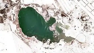 The lake is surrounded by deforested steppe landscape of low hills.[6]