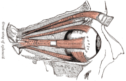 Anatomy of the eye. The external eye muscles are shown in red. | |