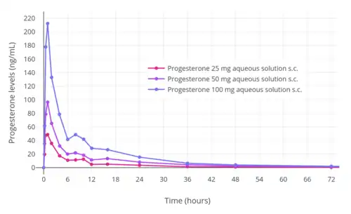 A number of other studies have also investigated the use of progesterone by sublingual administration.[111][112][113][108] Older studies have also explored sublingual progesterone.[114][115][116][117] A study of sublingual progesterone for luteal support in patients undergoing embryo transfer found that after sublingual administration of 50 or 100 mg progesterone dissolved in a 1 mL suspension, peak levels of progesterone were reached in 30 to 60 minutes and were on average 17.61 ± 3.78 ng/mL with the 100-mg dose.[111][112] However, the duration was short, with levels of less than 5 ng/mL at 6 hours, and re-administration had to be done two or three times per day for adequate circulating levels of progesterone to be maintained throughout the day.[111][112] Another study found that sublingual progesterone had to be administered at a dose of 400 mg every 8 hours to achieve circulating levels similar to those produced by 100 mg/day intramuscular progesterone.[111] One study administered 400 mg sublingual progesterone three times per day and achieved mean progesterone levels of 57.8 ± 37.4 ng/mL, which were similar to those produced by 50 mg/day intramuscular progesterone.[112]
